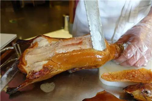 上面真空袋里的東西絕對不能稱之為北京烤鴨,吃北京烤鴨一定要到烤鴨店,吃剛出爐的,冒著熱氣端出來,廚師現(xiàn)場給您片,還得問您“片條,片片兒,還是皮肉分開”?