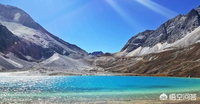 牛奶海,又名:俄絨措。湖水清瑩碧藍,狀如水滴,四周雪山環(huán)繞,風景秀麗。因其湖邊有一圈乳白色的鈣質沉積,故名牛奶海。